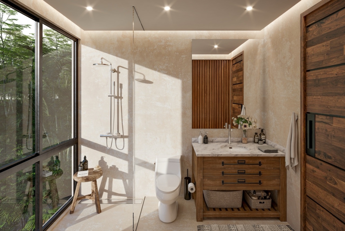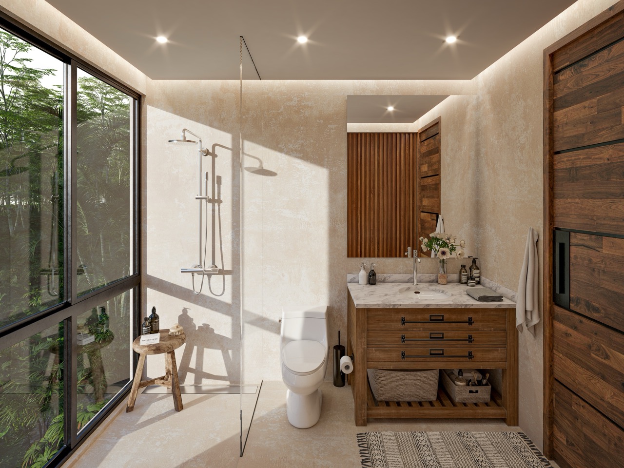 Los acabados en piedra maya, madera parota, mármol y chukum crean una atmósfera cálida, sofisticada y en total armonía con el entorno natural.